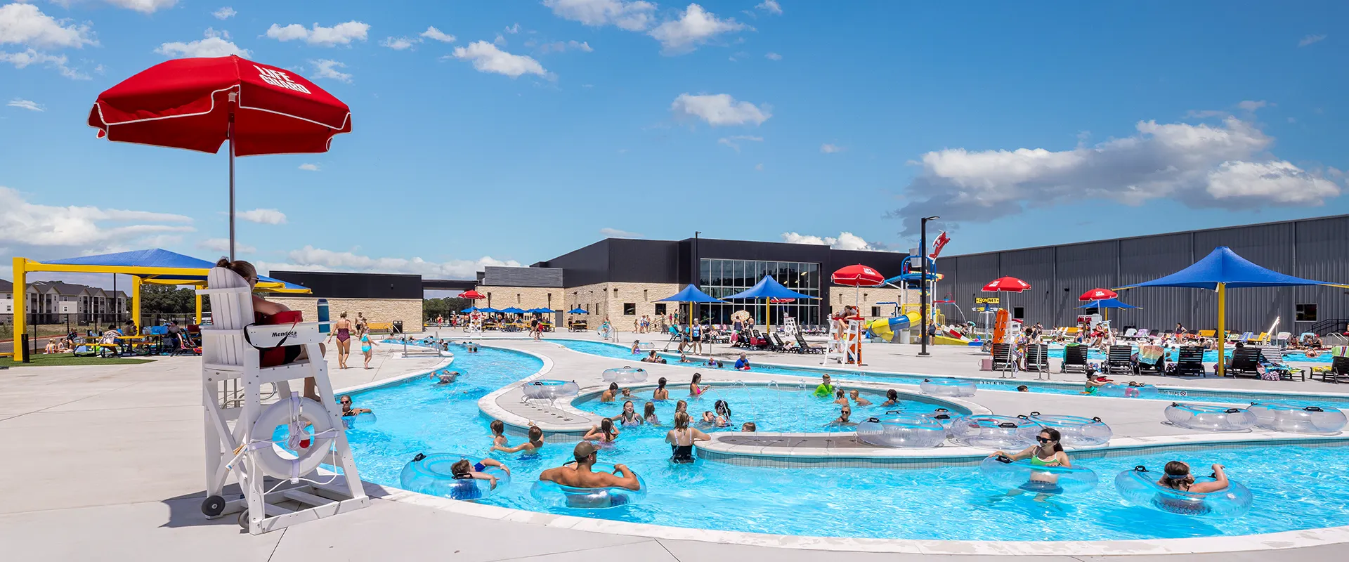 - Outdoor leisure pool with zero entry, play structures, and crossing activity.