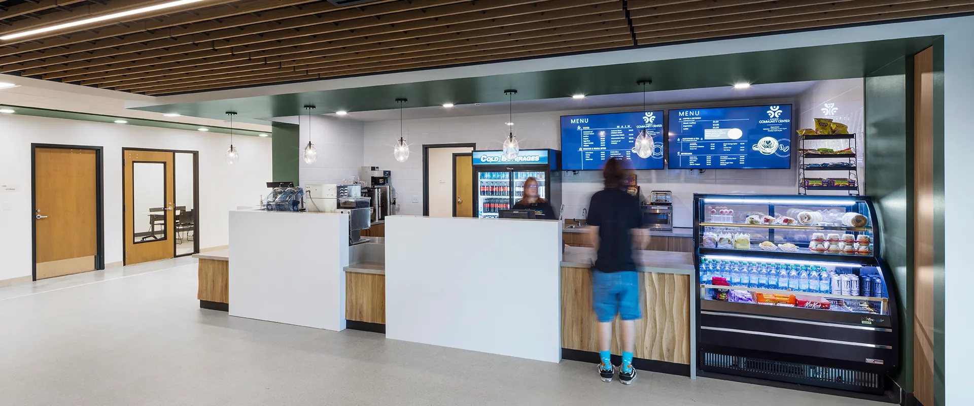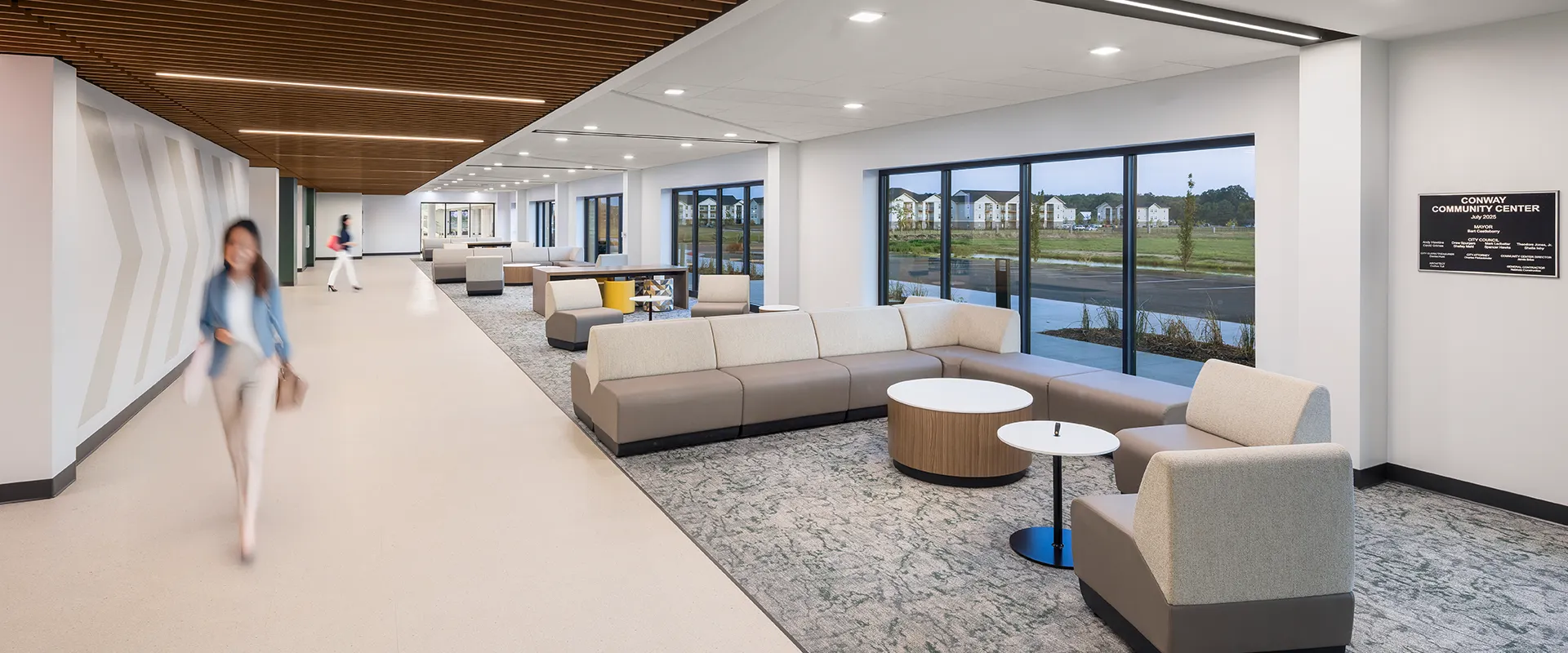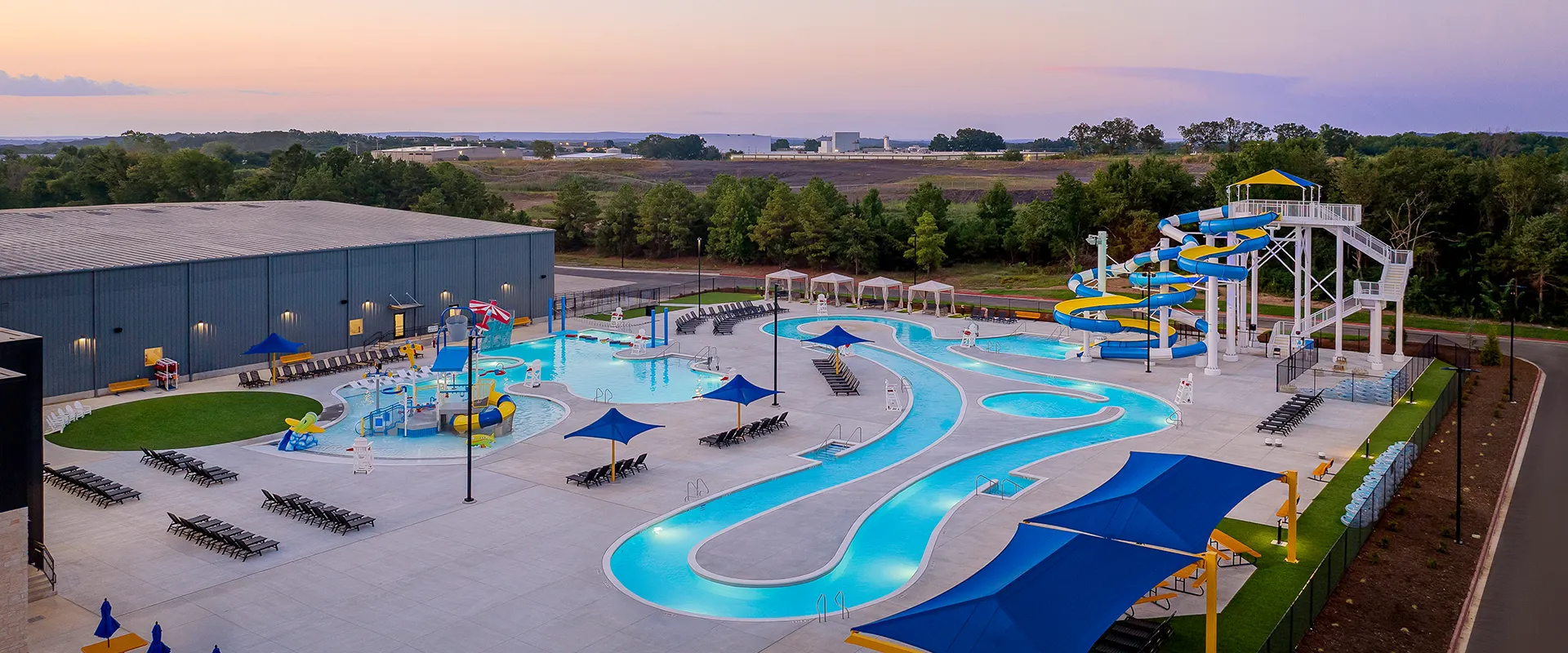 The design for the Conway Community and Aquatics Center renovated an existing 112,000 square-foot Acxiom warehouse and IT support building into a community center featuring indoor volleyball and pickleball courts, indoor competition and leisure swimming pools, and an extensive outdoor water park.